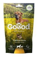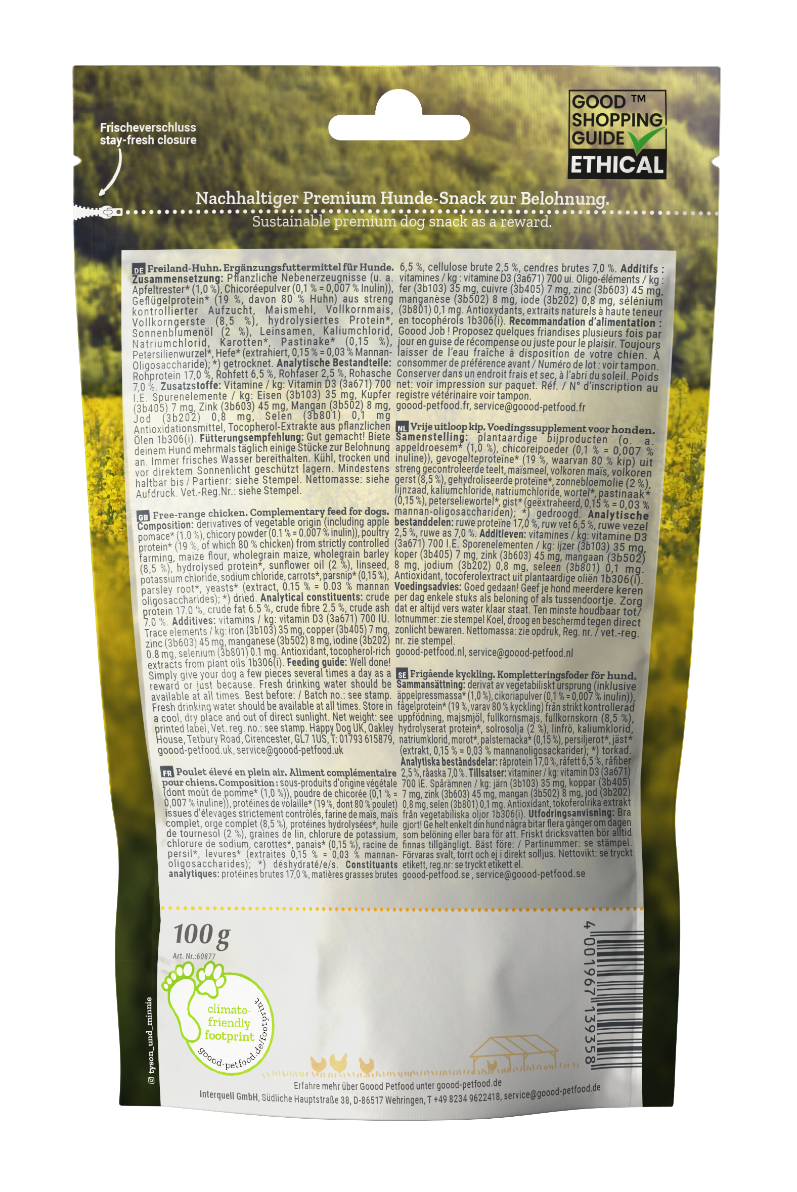 Our free-range chickens only get natural feed. You can taste it. In addition, there is valuable whole grain that provides energy for in between. Our soft gooodies are easily digestible. We generally do not use additives such as sugar, artificial colours, flavourings or preservatives. Instead, we rely on the natural power of high-quality ingredients. The club-shaped dog treats from Goood with chicken and parsnip are also good for digestion and metabolism.