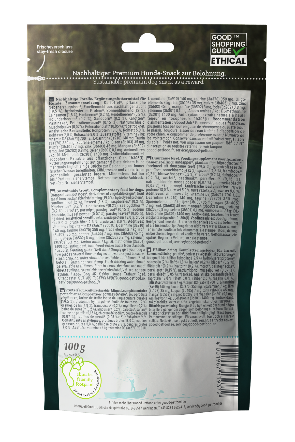 Soft gooodies are soft and juicy, easily digestible and good for skin and fur. Our trout come from species-appropriate, sustainable aquaculture. They contain a lot of protein and provide energy for in between meals. Our recipe does not need any added sugar or artificial colours, flavours or preservatives and is also tasty for dogs with sensitive stomachs and food intolerances.