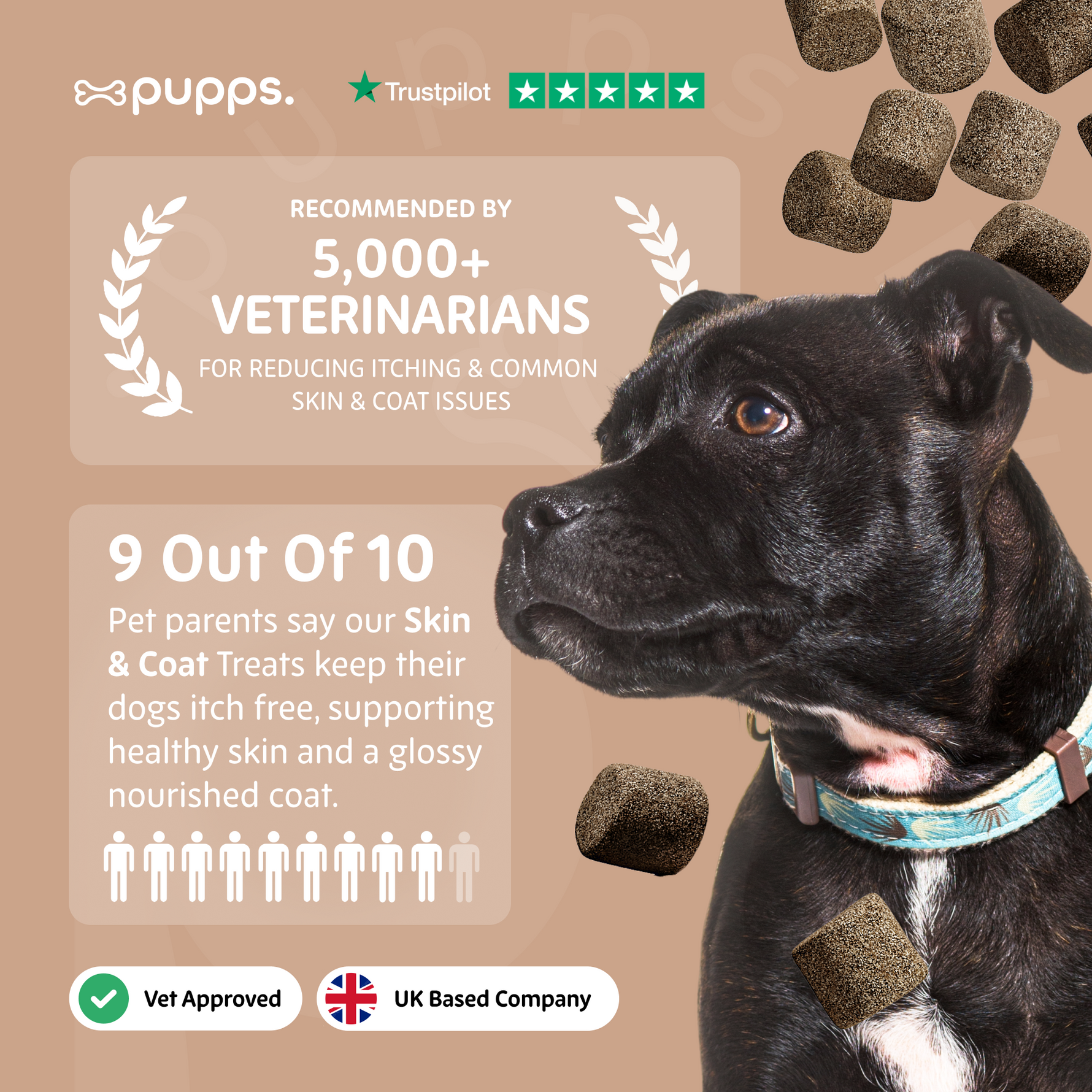 Improve your dog's coat with Pupps Skin & Coat Dog Treats. Enriched with omega-3 and omega-6 fatty acids, biotin, and zinc, these treats support skin health and improve coat condition. Perfect for dogs with dry skin or dull coats.