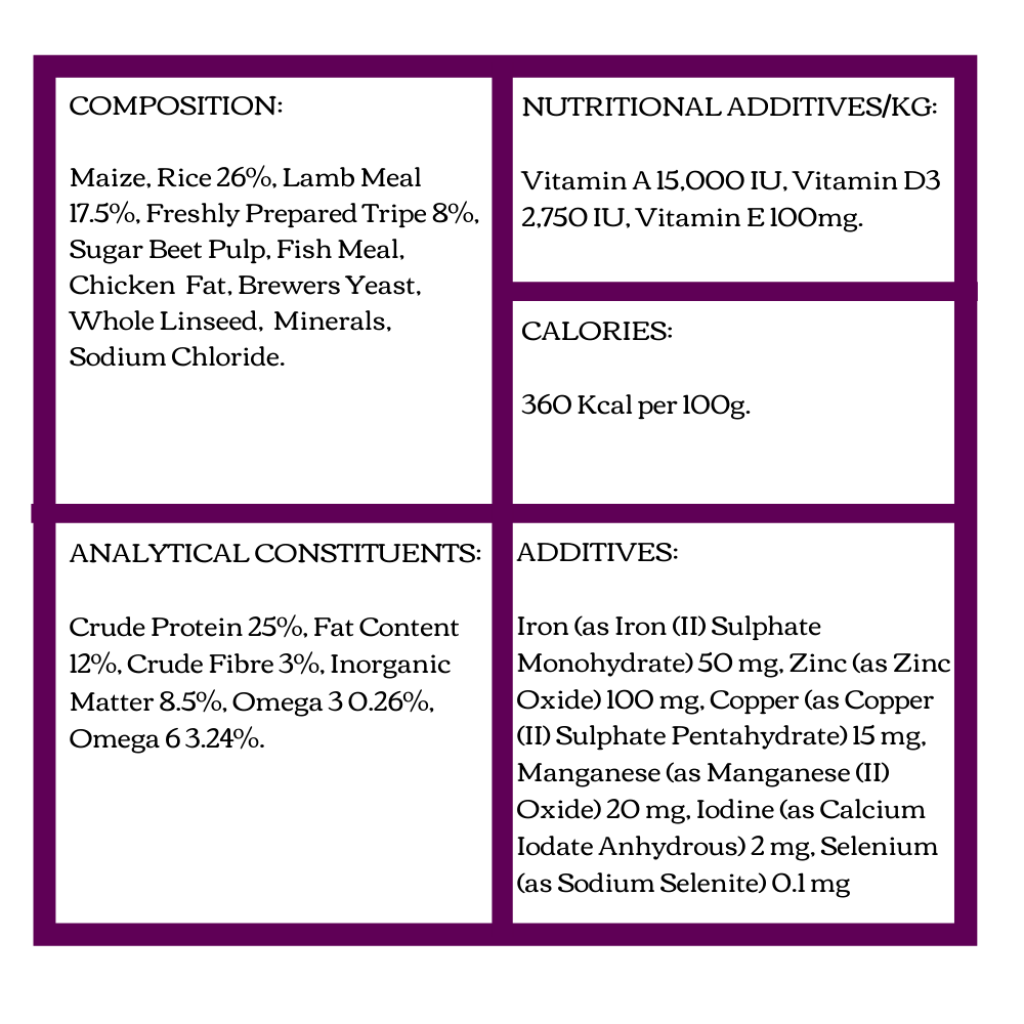 A nutritionally balanced kibble, developed, trialled and tested by working dog experts, Country Pursuit Premium Lamb, Rice and Tripe has been meeting the nutritional needs of thousands of adult dogs for many years.