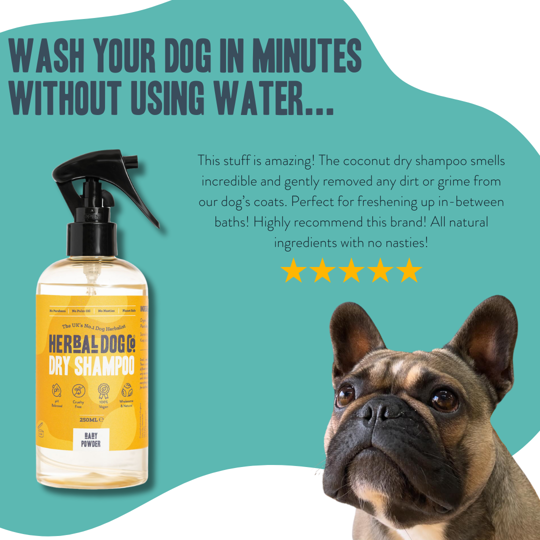 For a quick & easy way to remove dirt & grime from your dog’s coat, our Coconut Dry Shampoo offers a perfect grooming option to keep your furry friend feeling fresh & fragrant in between baths. Simply shake the bottle & spray a small amount onto their coat, brushing it through your pooch’s fur. Dirt, dust & pollen will lift away easily, keeping their coat soft & shiny, meaning that they stay nice & clean until their next bath.