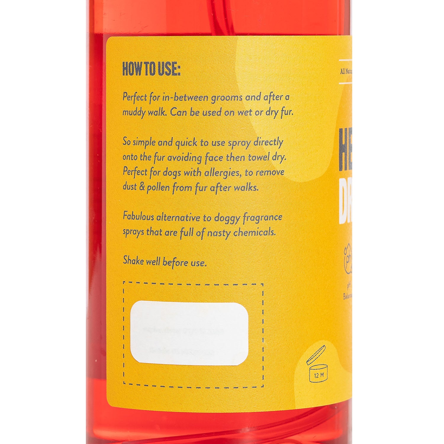 Raspberry and Vanilla Dry Shampoo, quick no mess dog bath, clean, moisturise, refresh, no rinse shampoo, deodorising, soothing and revitalising, spray onto a cloth or directly onto the fur.