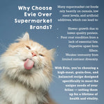 By contrast, Evie’s high-meat, grain-free, and pH-balanced formula provides your cat with nutrient-dense energy, promotes optimal weight, supports urinary health, and delivers delicious, species-appropriate nutrition without compromise.